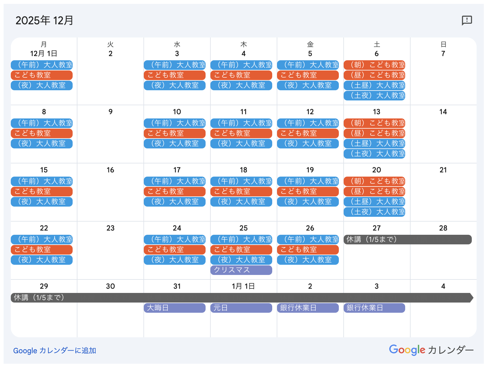 ↑Googleカレンダーを埋め込んでいます。(切れている場合は横にスクロール)