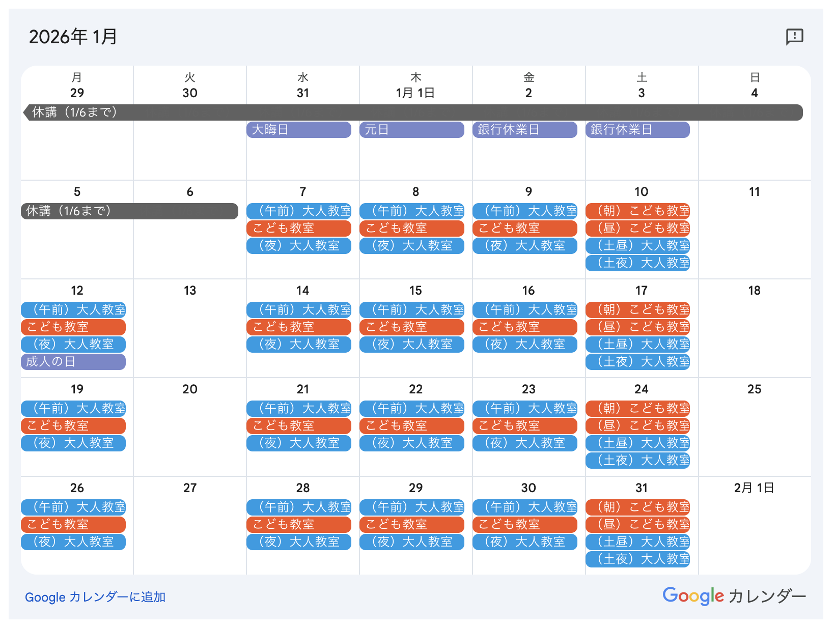 ↑Googleカレンダーを埋め込んでいます。(切れている場合は横にスクロール)