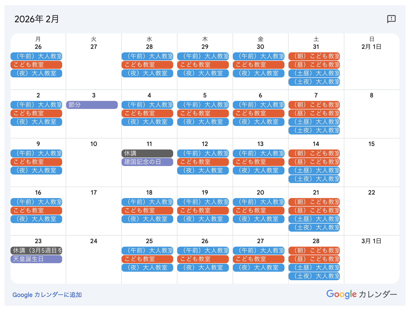 ↑Googleカレンダーを埋め込んでいます。(切れている場合は横にスクロール)